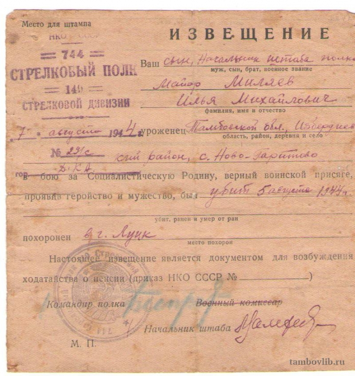 Извещение о гибели на фронте 5 августа 1944 года майора Миляева Ильи Михайловича1944 Межпоселенческая централизованная библиотека Петровского района Документ