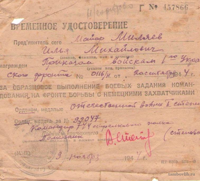 Временное удостоверение о награждении Миляева Ильи Михайловича Орденом Отечественной войны I степени1944 Межпоселенческая централизованная библиотека Петровского района Документ
