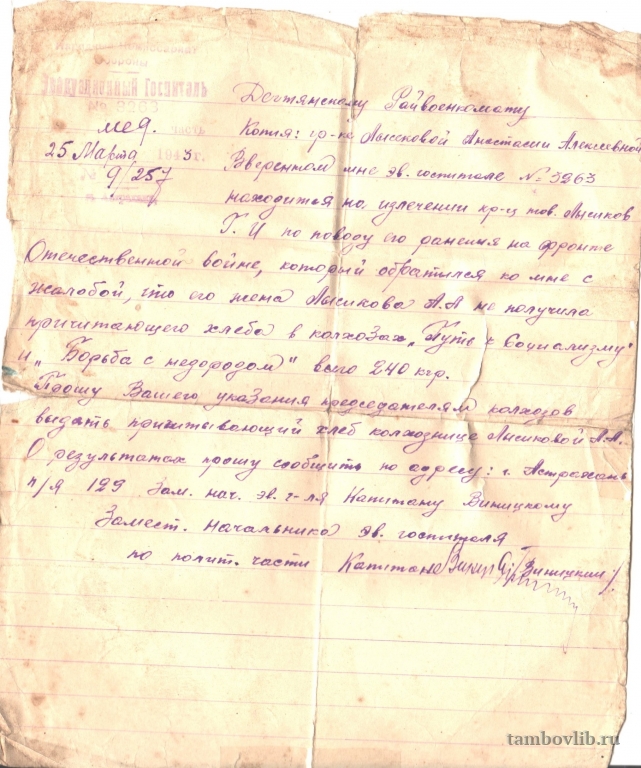 Родился 23 января 1911 года,в с. Советское Сосновского района. Участник Сталинградской битвы.Ответ начальника эвакуационного госпиталя, на жалобу о не выдаче хлеба его маме)25 марта 1943 Межпоселенческая центральная библиотека Сосновского района Документ