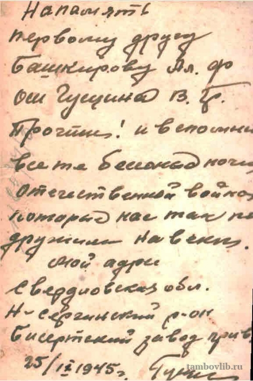 Родился в 1909 г. с. Кариан Знаменского района Тамбовской области. Демобилизован в 1945 г., рядовой. Шофер 3-го класса. Награждён орденом «Красной Звезды», орденом «Славы», орденом «Отечественной войны II степени», медалью «За Отвагу», медалью «За боевые заслуги», медалью «За Победу над Германией в ВОВ 1941-1945 гг.». В ознаменование 40-летия Победы в ВОВ награждён орденом «Отечественной войны II степени».Добавлена 26 Марта 2015