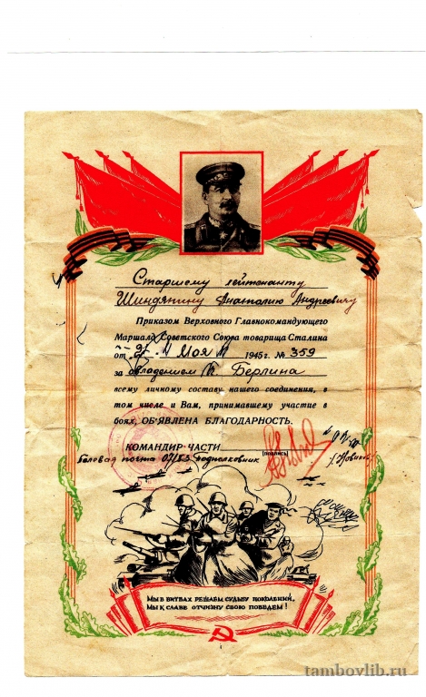 БЛАГОДАРНОСТЬ от 24 мая 1945 года А.А.Шиндяпину, старшему лейтенанту за взятие Берлина.