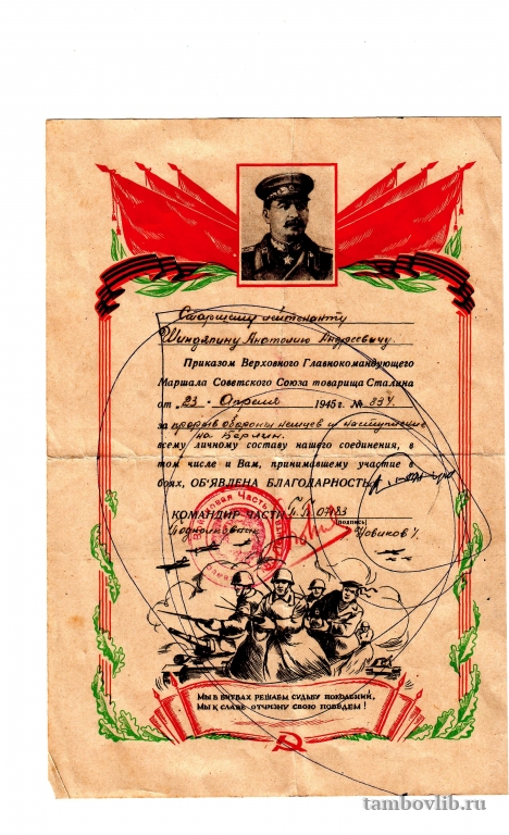 БЛАГОДАРНОСТЬ от 23 апреля 1945 года А.А.Шиндяпину, старшему лейтенанту, за прорыв обороны немцев и наступление на Берлин.