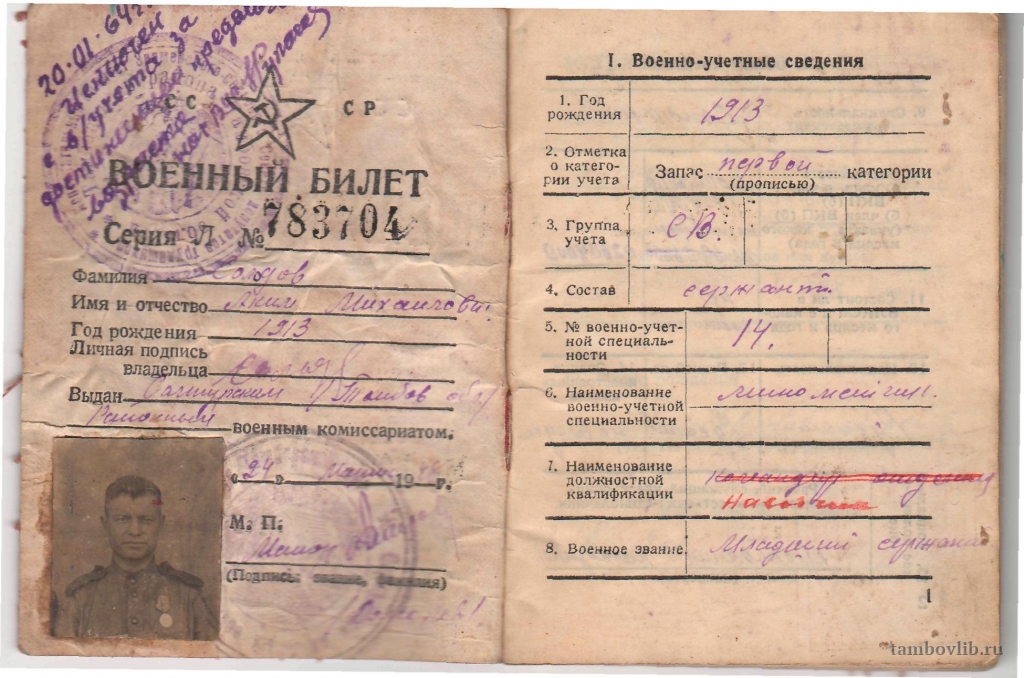 Военный билет Солодова Акима Михайловича
