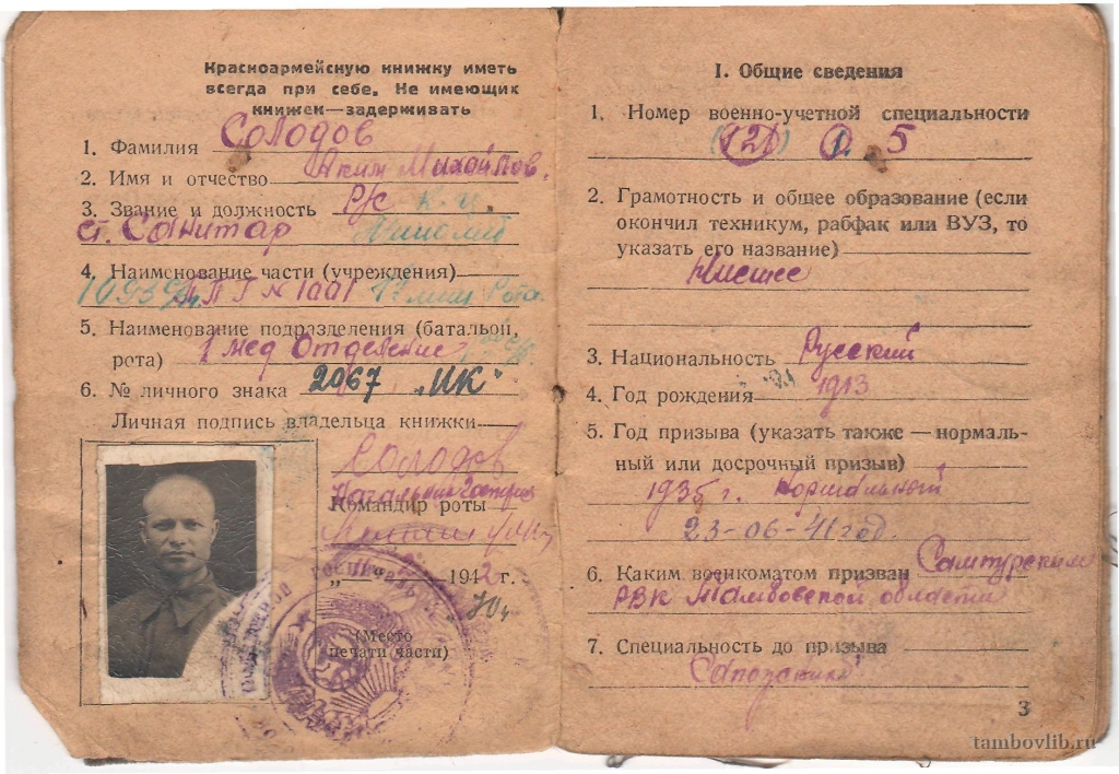 Красноармейская книжка Солодова Акима Михайловича