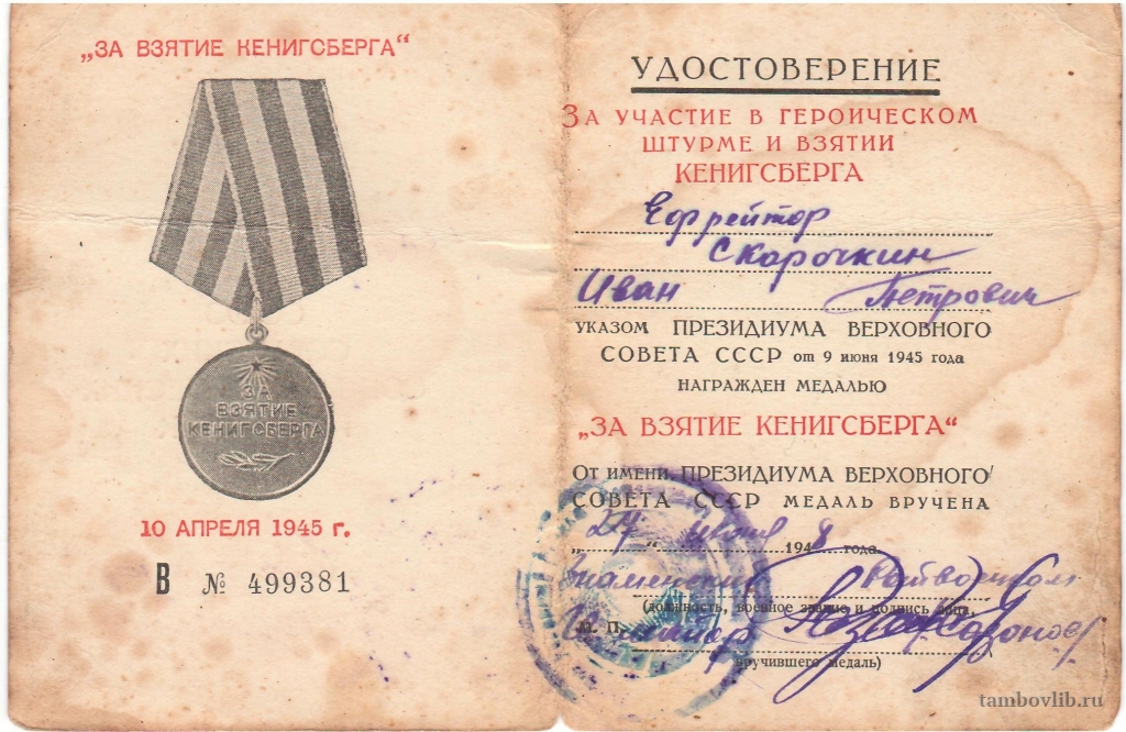 Удостоверение к медали "За взятие Кенигсберга" Скорочкина Ивана Петровича"