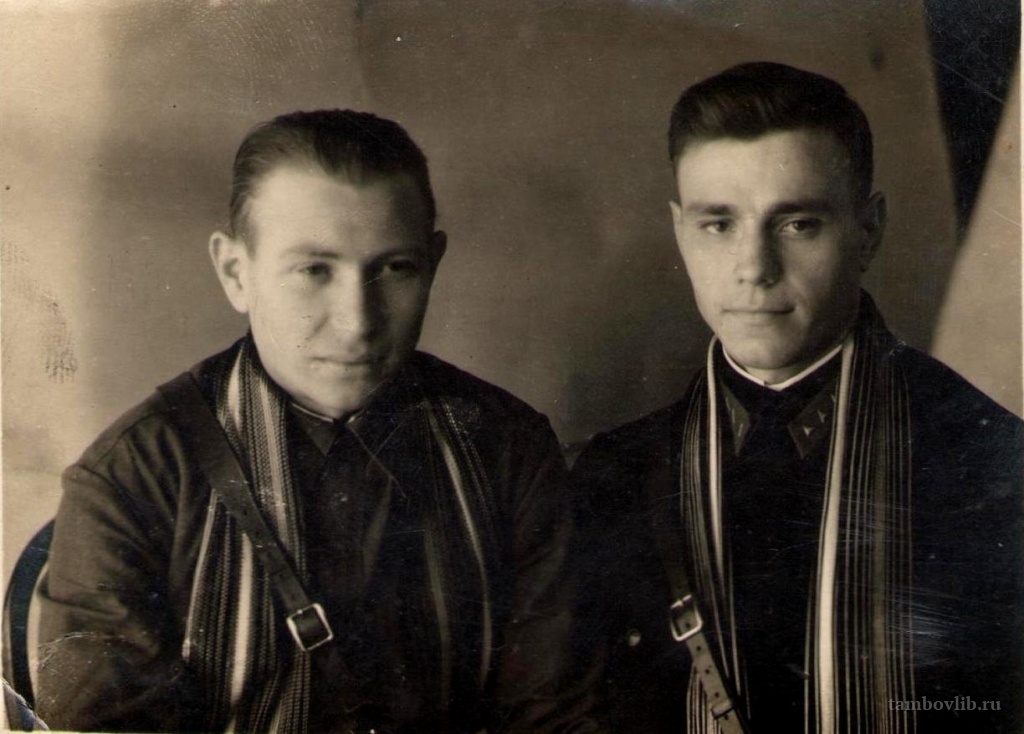 Воронков Константин Тимофеевич (справа) и Бебнев Владимир - участники Великой Отечественной войны. Воронков К. Т. призван в армию в 1940 году, демобилизован в 1946 году. Лейтенант. За период войны совершил 229 успешных боевых вылетов на Ленинградском, III Прибалтийском и II Прибалтийском фронтах. При выполнении боевых заданий проявил себя смелым, решительным и настойчивым штурманом. Имел большой боевой опыт, летал в сложных метеоусловиях. Награжден орденом Красной Звезды и Отечественной войны II степени. После демобилизации Константин Тимофеевич жил в р. п. Инжавино, работал в управлении сельского хозяйства, секретарем партийной организации в совхозе "Инжавинский". Фотография из семейного архива сына Воронкова Юрия Константиновича.1943, февраль Межпоселенческая центральная библиотека Инжавинского района Портрет
