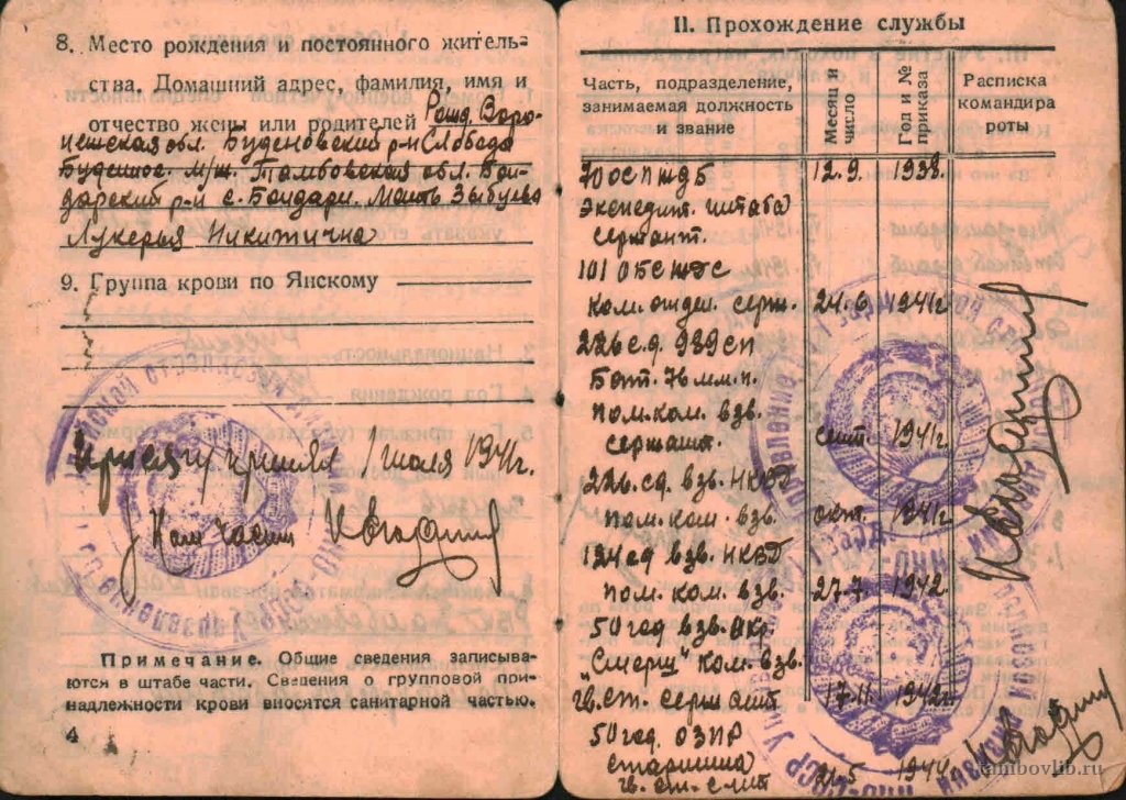 Родился 23 февраля 1918 г. в слободе Буденный Буденновского района Белгородской области. Образование 7 классов. В армию призван в сентябре 1938 г., демобилизован в мае 1946 г. Воевал на 10 фронтах, участвовал в Сталинградской битве, освобождал Кенигсберг. Победу гвардии старший сержант Зыбцев А.Д. Встретил в Берлине. Награжден орденами «Красной звезды» и «Отечественной войны II-ой степени», медалями «За боевые заслуги», «За оборону Сталинграда», «За взятие Кенигсберга», «За взятие Берлина», «За победу над Германией». После войны был на партийно-хозяйственной работе в Бондарском районе Тамбовской области. Умер 18 мая 1971 г. На фото Красноармейская книжка.Добавлена 29 Марта 2015