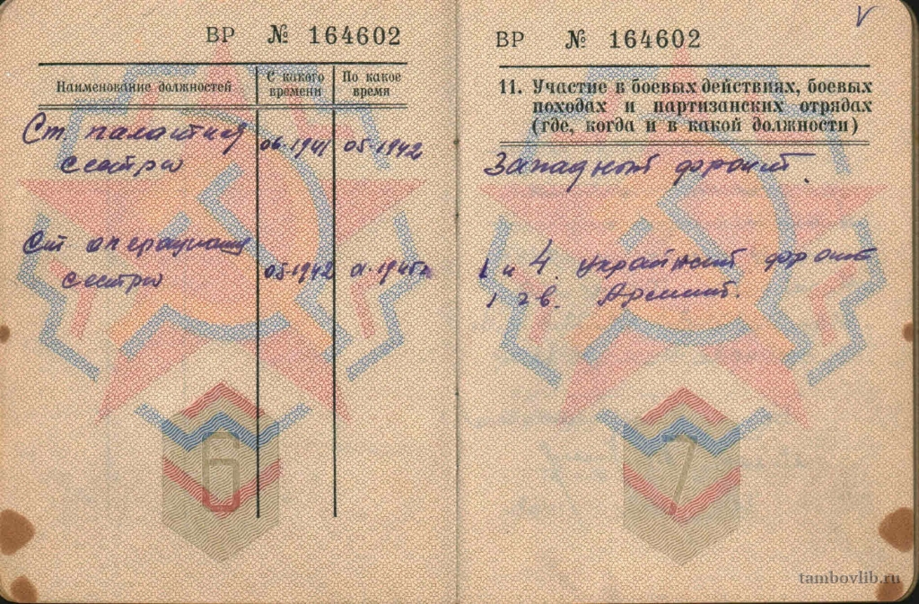 Родилась 7 апреля 1918 г. в с. Бондари Бондарского района Тамбовской области. В 1932 г. с отличием окончила Тамбовскую фельдшерско-акушерскую школу. Великая Отечественная война началась для Раисы Ивановны в 1941 г. с эвакогоспиталя в Москве. Затем была старшей операционной сестрой в армейском полевом подвижном госпитале I Гвардейской армии 4 Украинского фронта. Победу встретила в Польше в звании младшего лейтенанта медицинской службы. Награждена орденами «Красной звезды» и «Отечественной войны II степени», медалью «За победу над Германией». С 1945 г. и до выхода на пенсию трудилась старшей медсестрой в Бондарской больнице. Ветеран труда. Отличник здравоохранения. На фото Военный билет.Добавлена 29 Марта 2015
