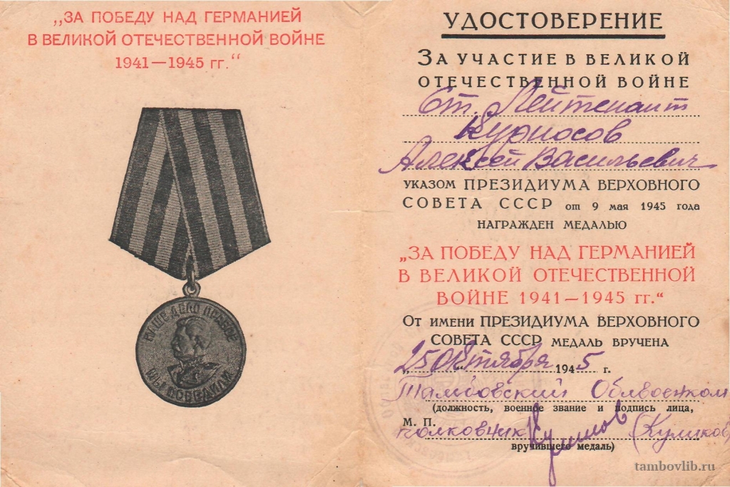 Медалью "За Победу над Германией в Великой Отечественной войне 1941-1945 гг." награжден Курносов Алексей Васильевич.25 октября 1945 Знаменская ЦБС Документ