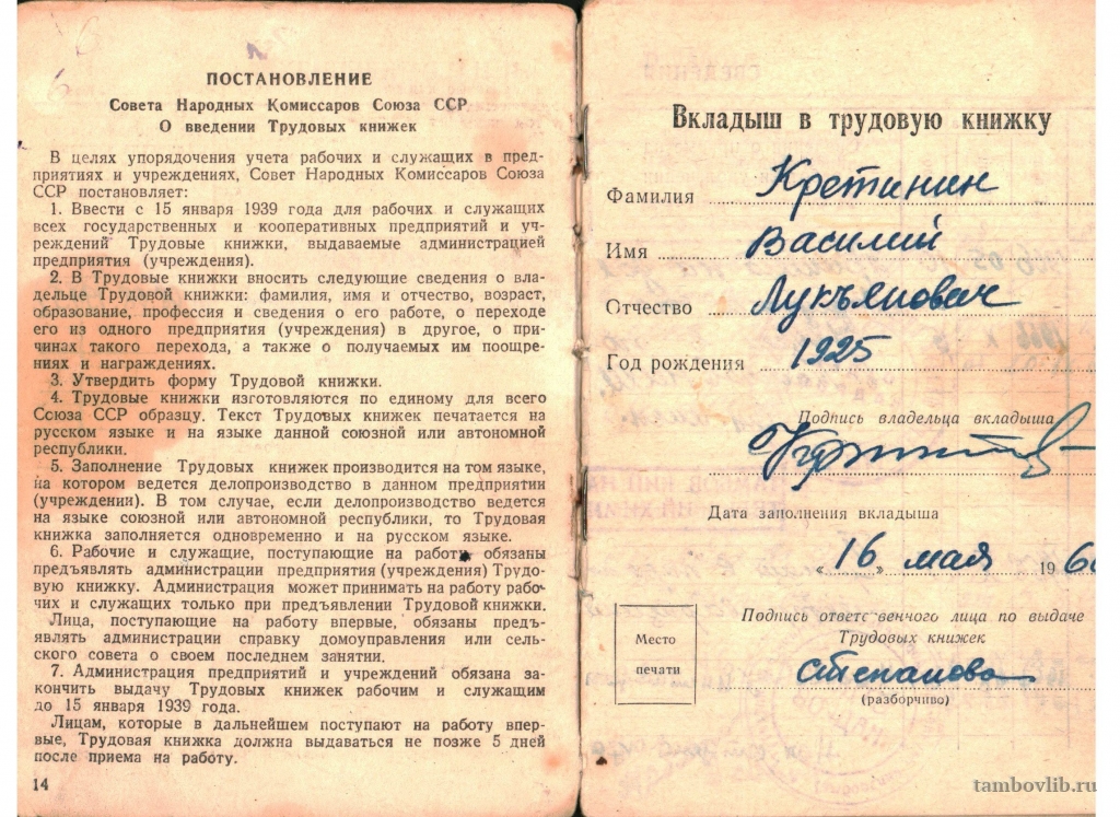 Трудовая книжка Кретинина Василия Лукьяновича