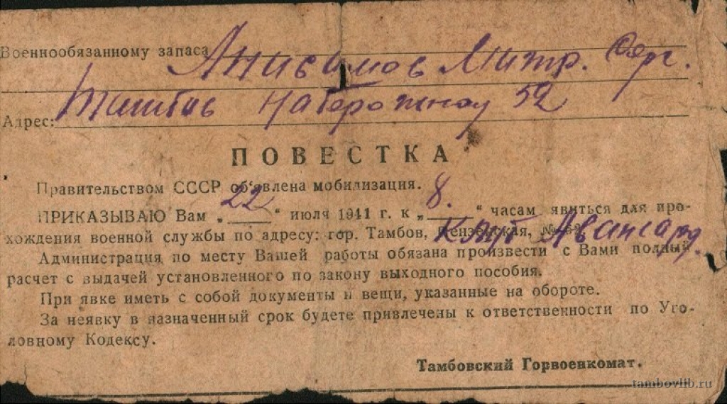 Повестка Анисимову Митрофану Сергеевичу