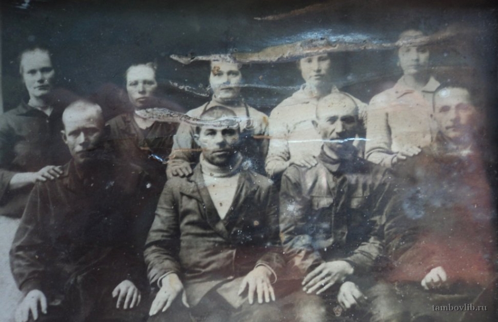 1-й ряд: Толкачёв Степан, Ряшенцев Николай Андреянович, Толкачёв Иван, Рощупкин Василий Астахович; 2-й ряд: Толкачёва Прасковья, Уродовских Любовь Ивановна, Ряшенцева Анна Прокофьевна, Толкачёва Мария, Рощупкина Мария.1941 Межпоселенческая централизованная библиотека Петровского района Портрет