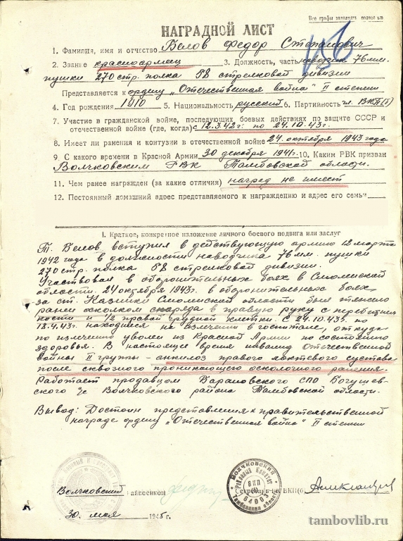 Родился в 1910 г. в деревне Барановка Петровского района Тамбовской области. Был призван в РККА 30 декабря 1941 г. Волчковским РВК Тамбовской области. Вступил в действующую армию 12 марта 1942 г. в должности наводчика 76 мм пушки 270 стрелкового полка 58 стрелковой дивизии. Участвовал в оборонительных боях в Смоленской области. С 24 октября 1943 г. по 18 апреля 1944 г. находился на лечении в госпитале, откуда по излечении был уволен из Красной Армии по состоянию здоровья. После войны работал в колхозе им. Коминтерна. Награжден медалью "За Отвагу", "За Победу над Германией в Великой Отечественной войне 1941-1945", Орденом Отечественной войны 2 степени. Умер в 1977 году.Добавлена 31 Марта 2015