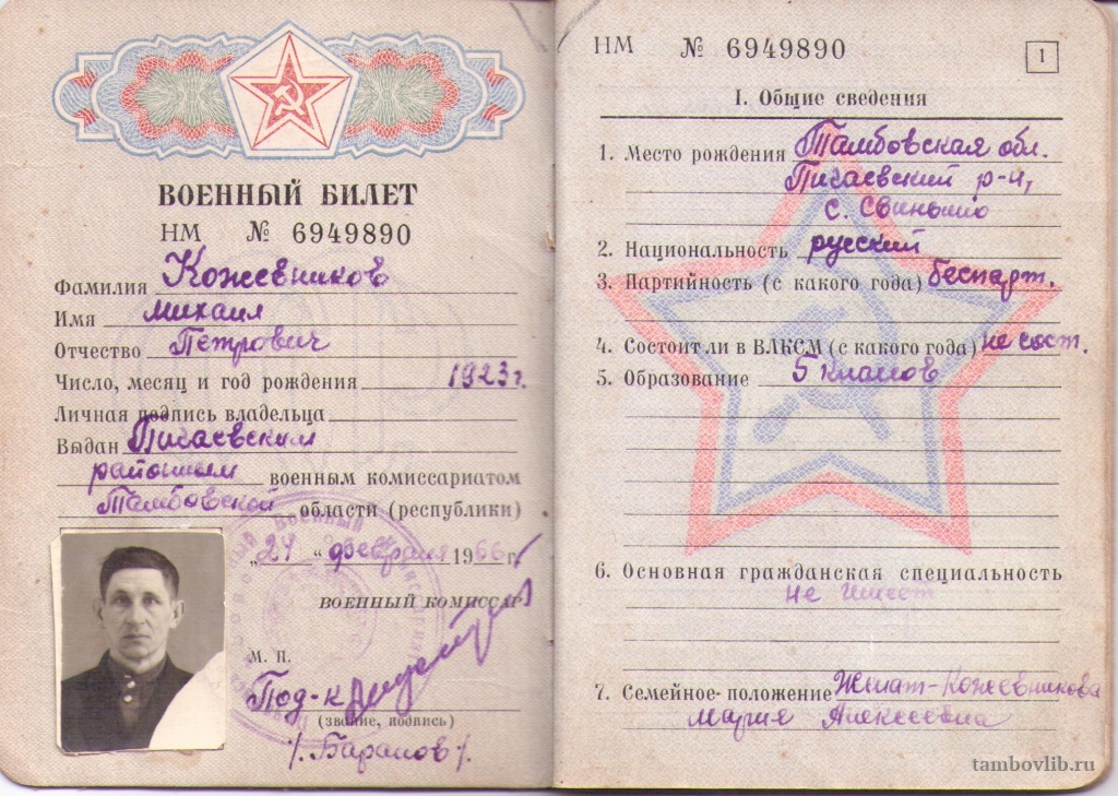 Военный билет Кожевникова Михаила Петровича(1923), с. Свиньино