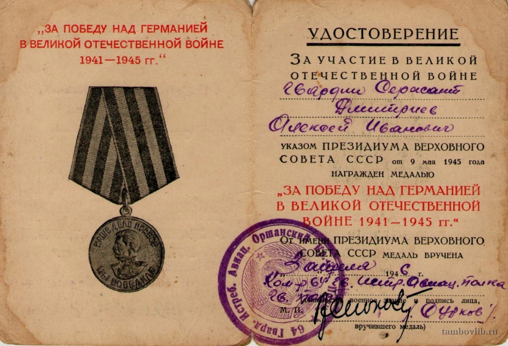 Дмитриев Алексей Иванович - участник Великой Отечественной войны. Гвардии сержант. Награжден медалями "За боевые заслуги", "За взятие Берлина", "За Победу над Германией в Великой Отечественной войне 1941 - 1945". В 90-е годы жил в р. п. Инжавино. Фотография из семейного архива Воронкова Юрия Константиновича.01 октября 1944 Межпоселенческая центральная библиотека Инжавинского района Документ