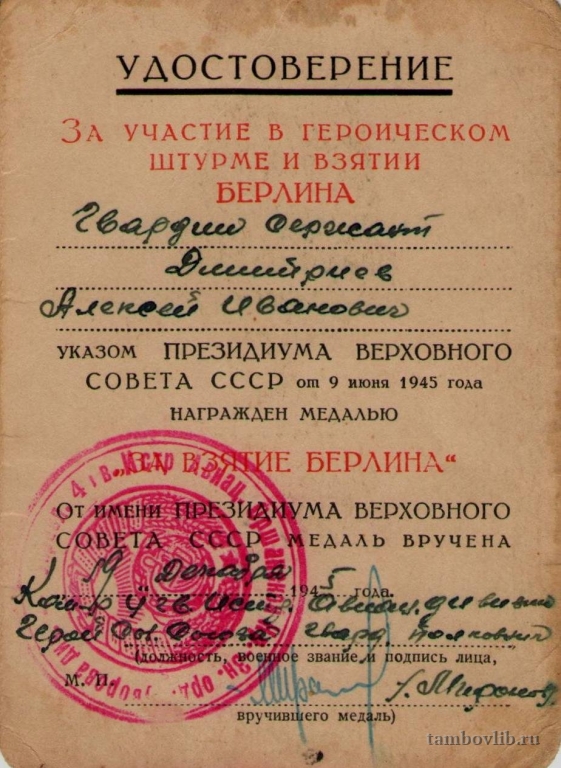 Удостоверение к медали "За взятие Берлина" Дмитриева Алексея Ивановича