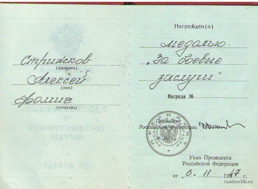Стрижков Алексей Фомич (1924 -1989) Родился 15 декабря 1924 года в с. Мучкап, Тамбовской области. Участник Великой Отечественной войны, служил в 331 стрелковом полку, старшина телефонных кабелей, получил ранение 8 февраля 1944 года. После войны 1946-1947 г.г. учился В Казанском танковом училище, 125 танковый полк, командир средних танков. Уволен в запас 23 марта 1947 года. Награды: Орден Отечественной войны II степени, медаль "За Победу над Германией" и юбилейные медали. Фото предоставила дочь Доброхотова Валентина Алексеевна.1947 Центральная библиотека Мучкапского района Документ