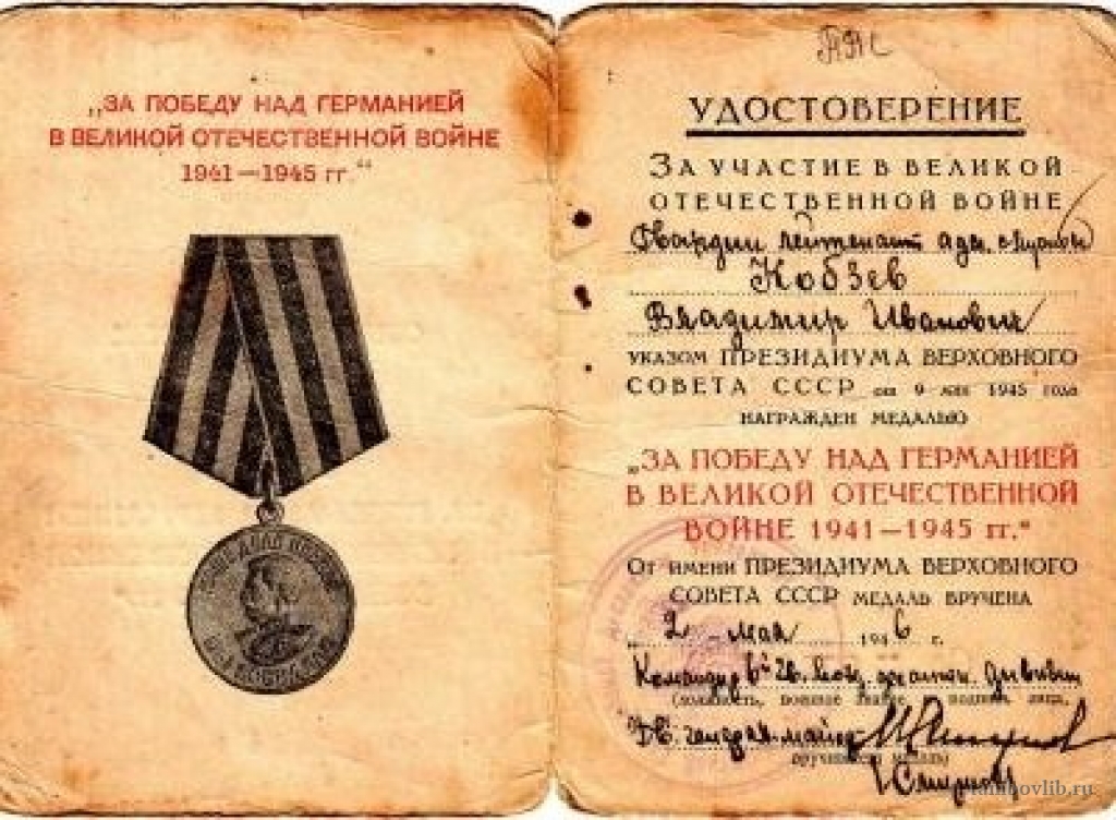 Кобзев Владимир Иванович, удостоверение к медали "За победу над Германией"