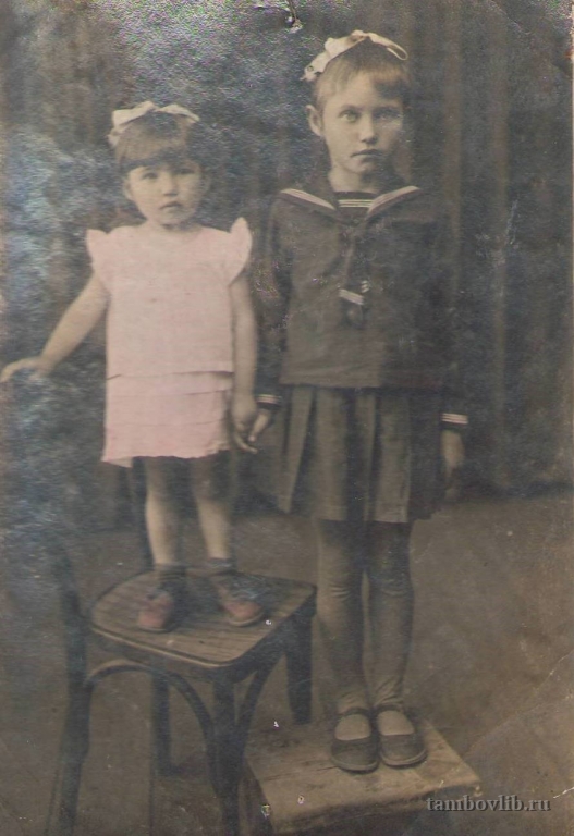 Каверина (в замужестве Шигорева) Валентина Михайловна, родилась 01.01.1938 г. с.Мучкап Тамбовской области (слева). Каверина (в замужестве Муженская) Зоя Михайловна, родилась 02.01.1933 г. с. Мучкап Тамбовской области (справа). Фото предоставила дочь Муженской З.М. Муженская Татьяна Федоровна.1941, июль Центральная библиотека Мучкапского района Портрет Мучкапский, Тамбовская область, Россия