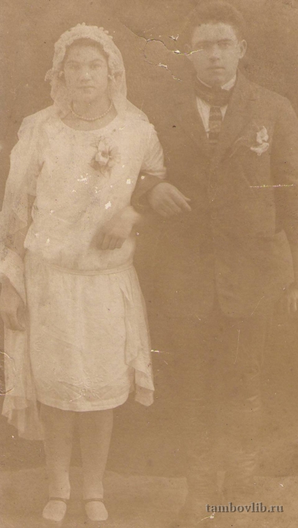 Каверина ( в девичестве Александрова) Ольга Владимировна 1910 года рождения и Каверин Михаил Иванович 1909 года рождения уроженца с. Мучкап Тамбовской области в день бракосочетания. Ольга Владимировна с 1935 по 1960 г.г. работала на Мучкапском птицекомбинате рабочей птицеубойного и колбасного цехов. Испытала все тяготы военного и послевоенного времени. Каверин Михаил Иванович участник Великой Отечественной войны, пропал без вести 18.02.1943 года. Фото из семейного архива Муженских, предоставлено внучкой Муженской Татьяной Федоровной.