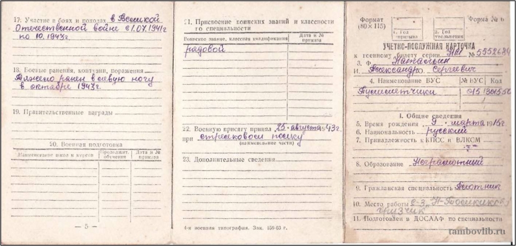 Учетно-послужная карточка Натальина Александра Сергеевича (1915-1981)