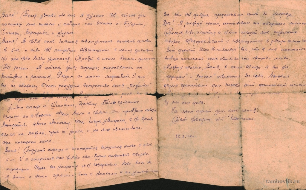 Письмо Ландыреву Ивану Николаевичу от зам.комбата 433 отдельного саперного батальона Г.И. Кравченко