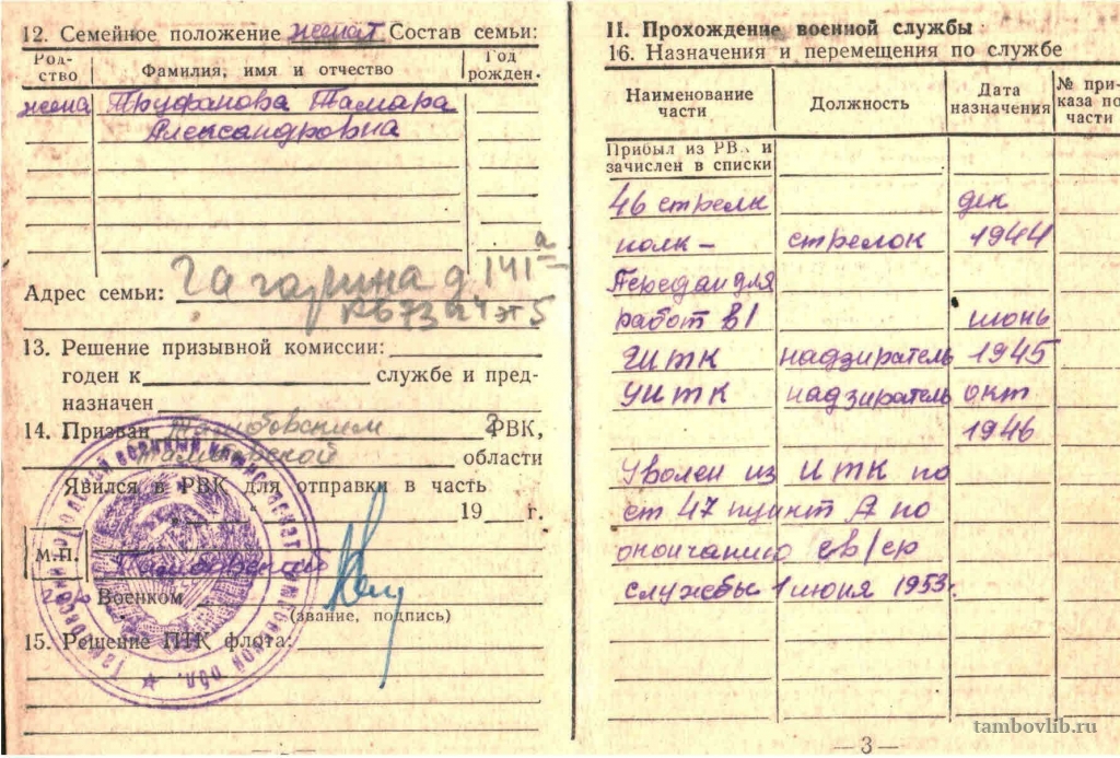 Родился 10 мая 1927 г. в с. Терехово хутор «Пионер» Старо-Оскольского района Курской области. Был призван в армию в 1944 г. Принимал участие в войне с Японией с августа по сентябрь 1945 г. в составе 46 стрелкового полка в должности стрелка. 2 января 1951 г. был назначен в ИТК Южно-Сахалинской области надзирателем. 1 июня 1953 г. был уволен из ИТК по окончании службы. С 1954 г. работал поездным кочегаром. Награжден в ознаменование 40-летия Победы в ВОВ орденом «Отечественной войны II степени», медалью «Жукова». На фото Учетно-послужная карточка.Добавлена 3 Апреля 2015