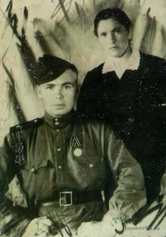 Григорий Николаевич Яблонских (1927 - 2014) - участник Великой Отечественной войны. Родился в с. Паршиновка Липецкой области. В армии с 1944 года. Служил в Ленинградской области, станция Гатчино, в батальоне охраны узловой станции. Жена Григория Николаевича Евдокия Константиновна (1923 г. р.) во время войны работала трактористкой. Супруги Яблонских прожили вместе более 60 лет, воспитали восьмерых детей. Проживали в Сампурском районе. Снимок сделан во время отпуска, предоставленного Григорию Николаевичу в связи с женитьбой. Фотография предоставлена дочерью Мартыновой Наталией Григорьевной.1947 Межпоселенческая центральная библиотека Инжавинского района Семейное