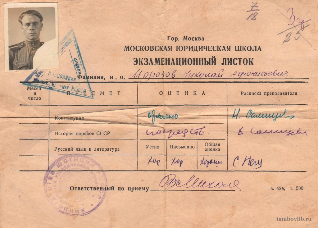Экзаменационный листок Морозова Николая Афанасьевича