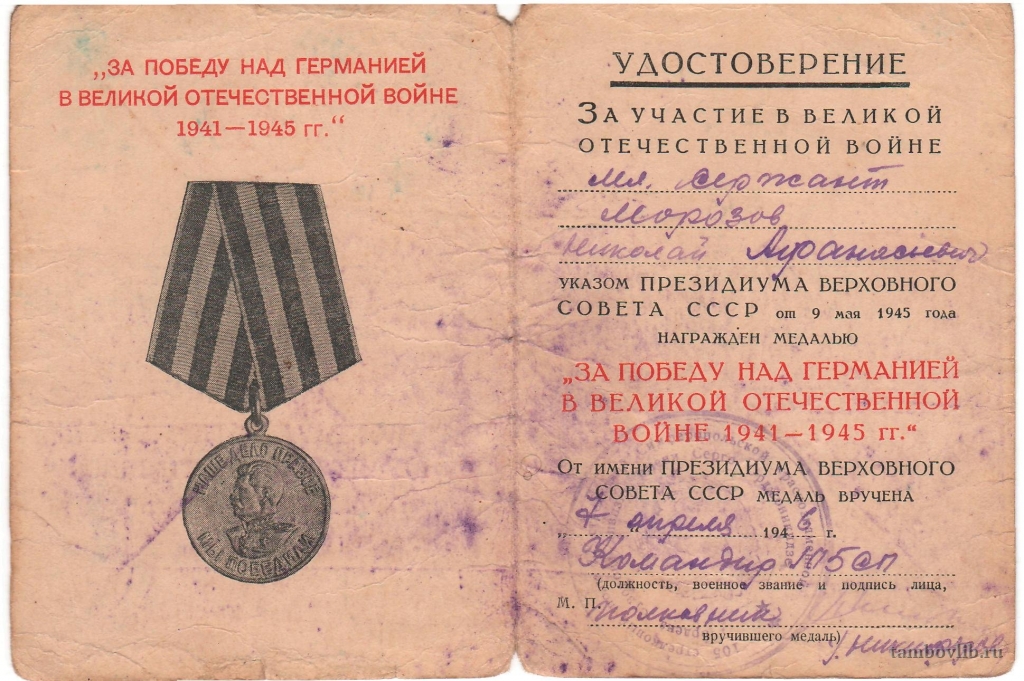 Удостоверение к медали "За Победу над Германией в Великой Отечественной войне 1941-1945 гг." выдано Морозову Николаю Афанасьевичу