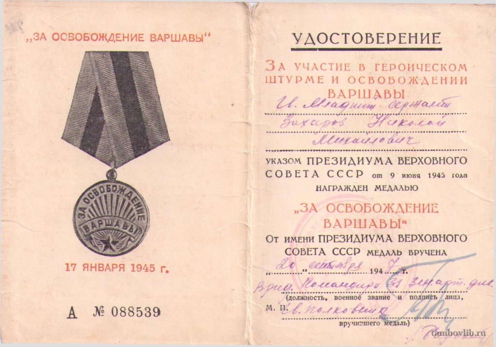 Удостоверение Захарова Николая Михайловича, с. Пичаево