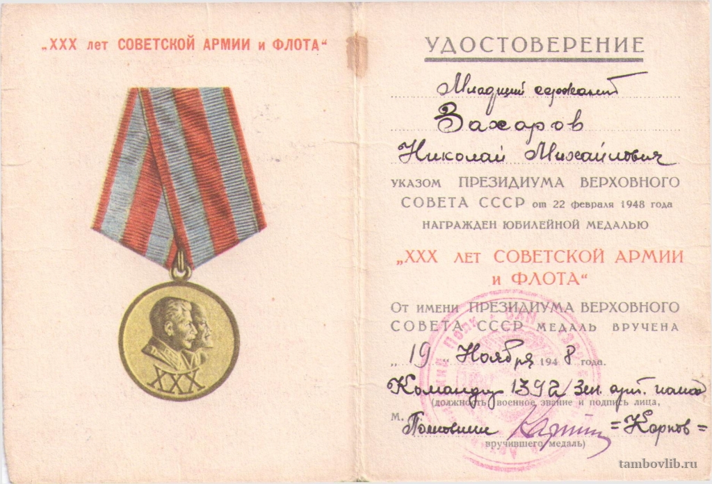 Удостоверение Захарова Николая Михайловича, с. Пичаево