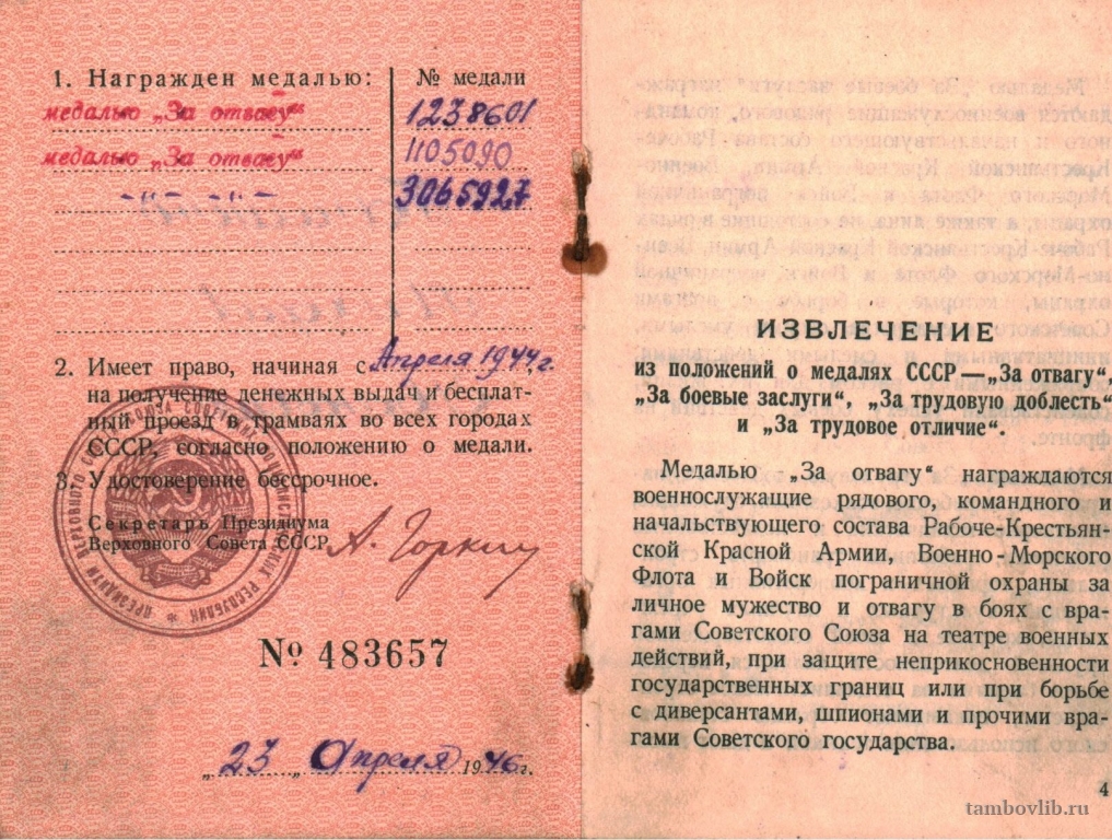 Удостоверение к медали Ганьшина Михаила Ивановича
