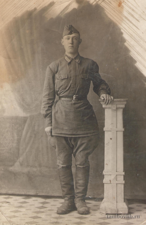 Егоров Алексей Тихонович, 1920 г. р., уроженец с. Богданово Ржаксинского района. Был призван в армию в 1941 г., демобилизован в 1944 г. Младший сержант. Награжден орденом Красной Звезды, медалями "За освобождение Праги", "За взятие Берлина", "За Победу над Германией". Умер в 1979 г.1944 Межпоселенческая центральная библиотека Ржаксинского района Портрет