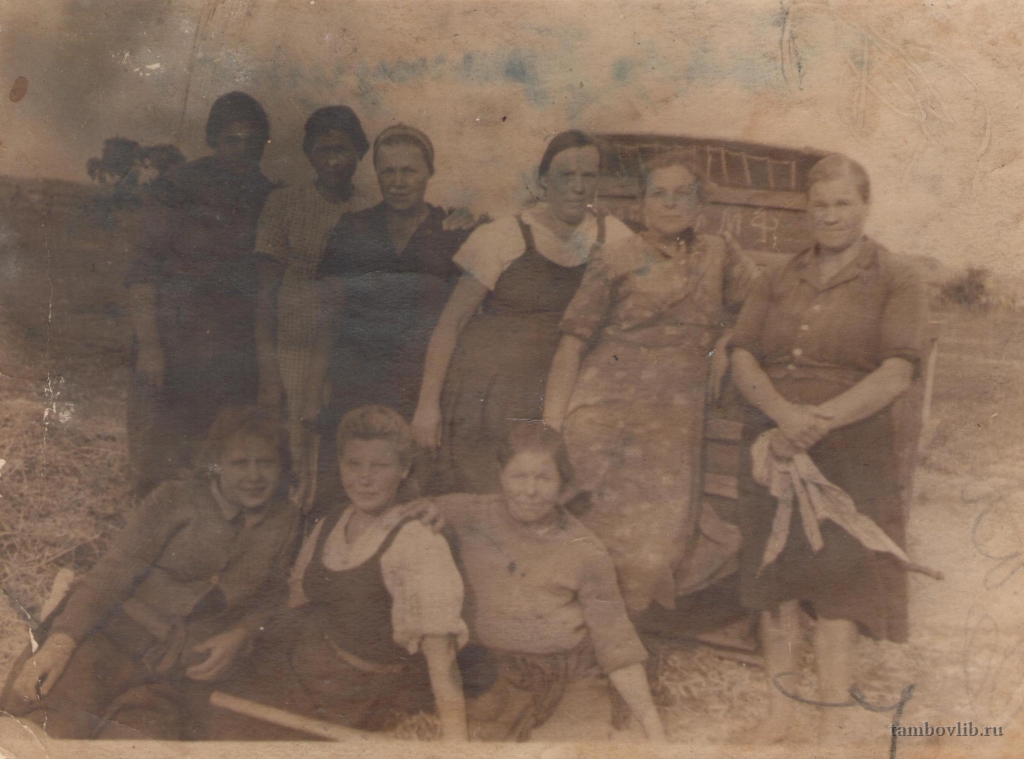 Женщины села Богданово на уборке урожая, среди них Гаврюшина Мария Ивановна (стоит справа), Ермакова Татьяна Тихоновна (стоит вторая справа) Трушкина Мария Матвеевна (стоит третья справа)1940 Межпоселенческая центральная библиотека Ржаксинского района Портрет Богданово, Тамбовская область, Россия, 393524