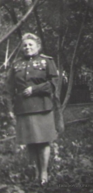 В 1941 году была призвана в армию медицинской сестрой, состояла в 195-ой стрелковой дивизии. Участвовала в разминировании г.Сталинграда, служила в эвакогоспитале №3637. Награждена: орденом "Отечественной войны II степени", медалью "За победу над Германией".Межпоселенческая центральная библиотека Жердевского района Семейное