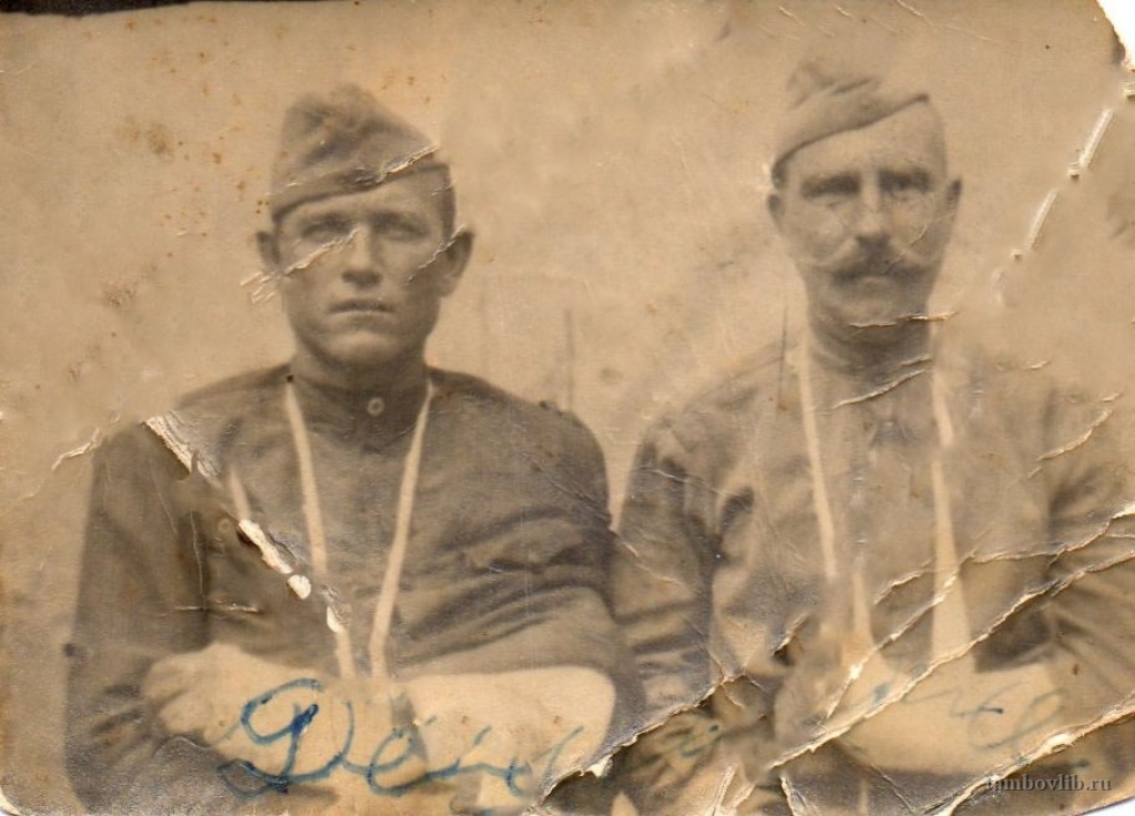 Родился 5 марта 1912 г. в д. Телешовка Платоновского района Тамбовской области. 15.10.1934 г. Бондарским РВК призван в ряды Красной Армии и далее зачислен в запас. В 1940 г. переехал на заработки на Дальний Восток. Призван по мобилизации Шмаковским РВК Уссурийской области и зачислен в 277 отдельный батальон сапёром в 1941 г. Далее службу продолжал в должности стрелка в 36 отдельной стрелковой бригаде. В 1944 г. был ранен и уволен по ранению в запас. Награждён орденом «Красной Звезды», медалью «За боевые заслуги», медалью «За Победу над Германией», а также в ознаменование 40-летия Победы в ВОВ награждён орденом «Отечественной войны II степени» и юбилейными медалями. Умер 25 мая 1996 г. На фото слева.Добавлена 7 Апреля 2015