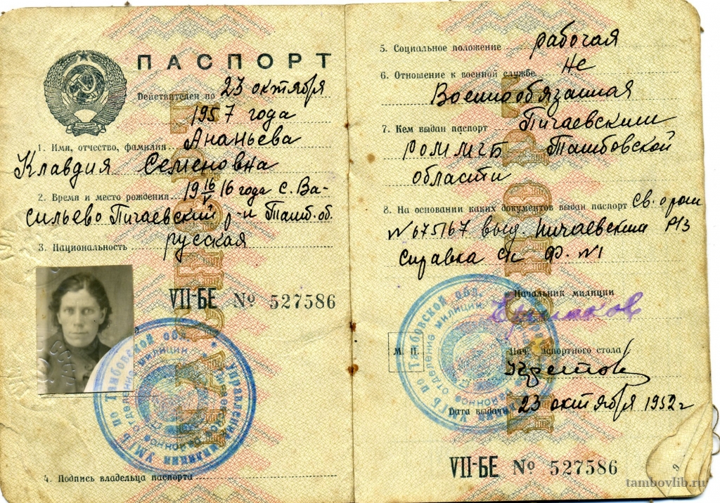 Паспорт Ананьевой Клавдии Семеновны, полученный после войны.