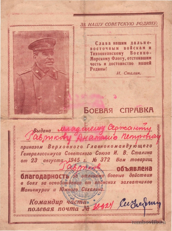 Боевая справка выдана младшему сержанту Гаврикову Анатолию Петровичу. Из семейного архива Ланьшиных.