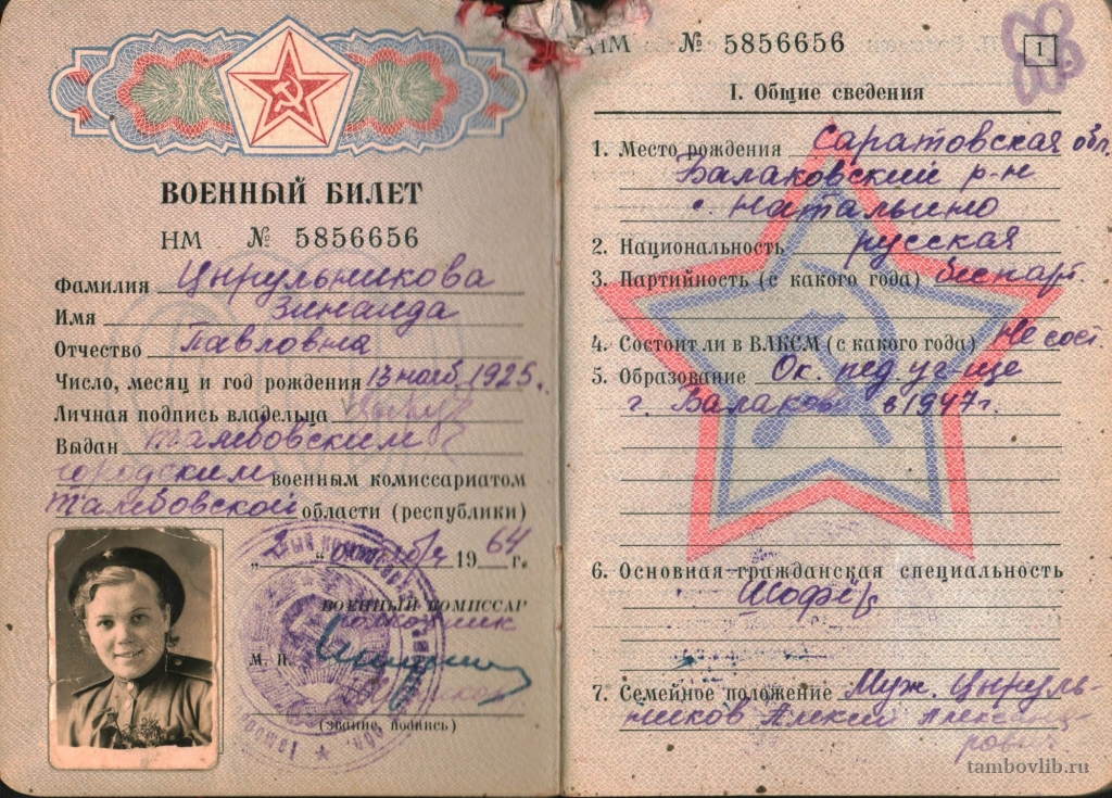 Военный билет Цырульниковой (Францевой) Зинаиды Павловны