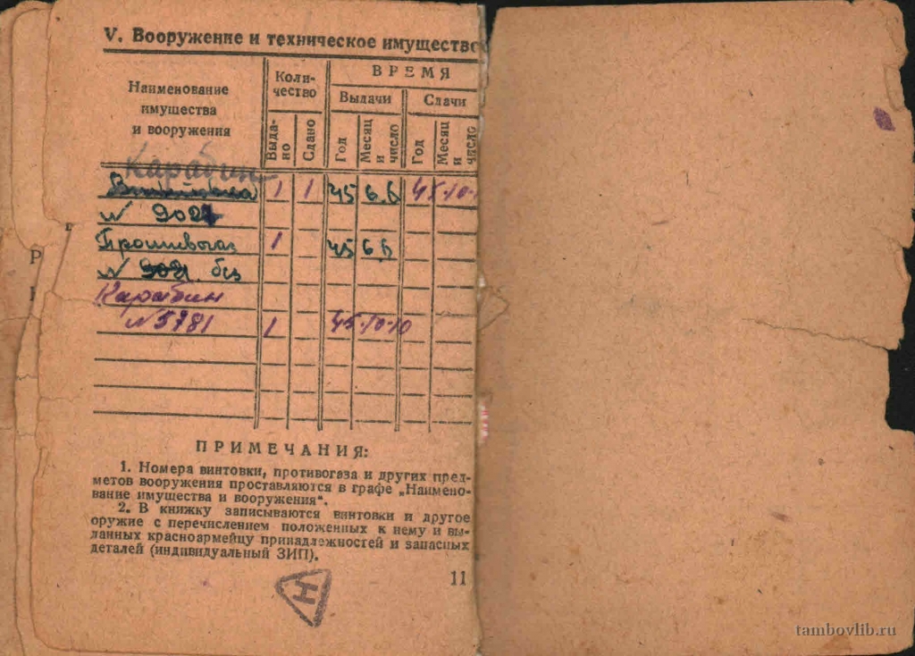 Родился 9 февраля 1922 г. в г. Тамбове. До войны был слесарем на заводе. В 1941 г. ушёл красноармейцем на фронт. Был участником обороны Севастополя. В 1942 г. попав в окружение и приняв неравный бой, попадает в плен. Далее переплавлен в открытый лагерь для военнопленных на территории Польши, в котором находился по 1944 г. Вместе с товарищем совершает побег из лагеря. 15 марта 1945 г. попадают в партизанский отряд товарища Колосова, в котором находился по 29 мая 1945 г. Войну закончил в Чехословакии. К 40-летию победы награждён орденом «Отечественной войны II степени» и юбилейными медалями. Умер 24.02.1993 г. На фото Красноармейская книжка.Добавлена 9 Апреля 2015