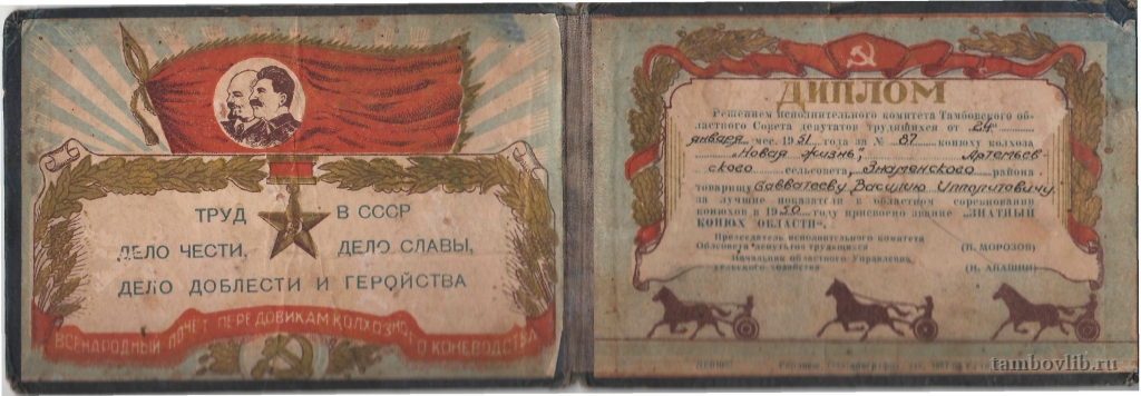 Диплом о присвоении звания "Знатный конюх Тамбовской области" Савватееву Василию Ипполитовичу