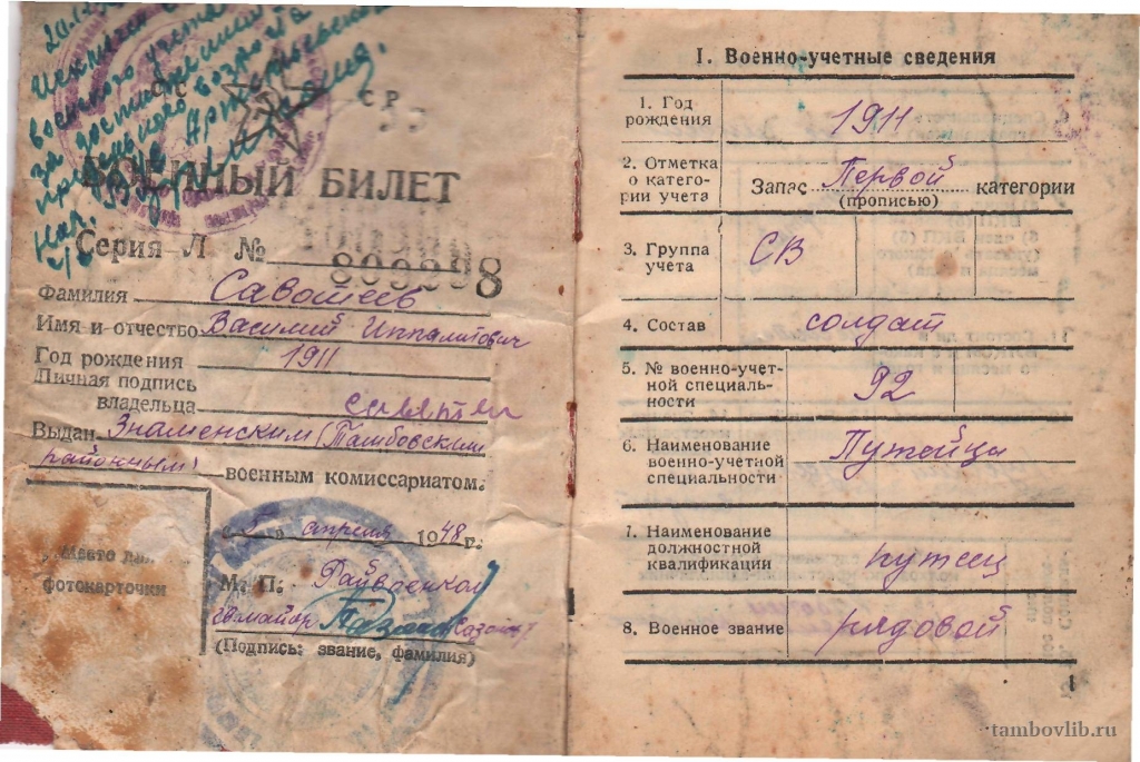 Савватеев Василий Ипполитович родился 22 января 1911 года в деревне Михайловка Знаменского района Тамбовской области. Призван в ряды РККА 11 октября 1933 года. После прохождения срочной службы был уволен в запас. 24 июня 1942 года был призван на фронт. Воевал в составе 20-го отдельного железнодорожного батальона и 12-го железнодорожного полка. Рядовой. Путеец. Демобилизован 17 ноября 1946 года. Награжден медалями "За взятие Берлина", "За Победу над Германией в Великой Отечественной войне 1941-1945 гг.". После войны жил и работал на родине. В 1951 году ему было присвоено звание "Знатный конюх Тамбовской области". Умер 8 мая 1976 года. Фото из семейного альбома дочери, Мутовкиной Раисы Васильевны. 03 июля 1945 Знаменская ЦБС Портрет Берлин, ГерманияДобавлена 10 Апреля 2015