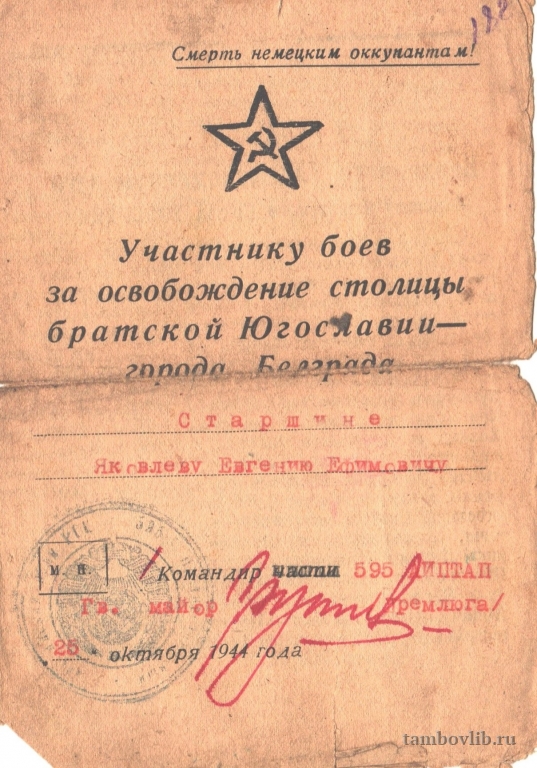 Участнику боев за освобождение столицы братской Югославии-Белграда25 октября 1944 Межпоселенческая центральная библиотека Сосновского района Документ
