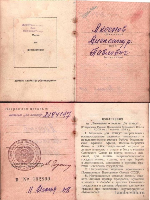 Удостоверение к медали "За отвагу"