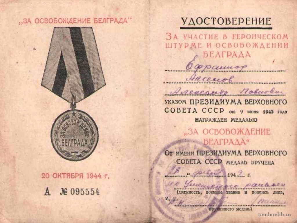 Удостоверение к медали "За освобождение Белграда"