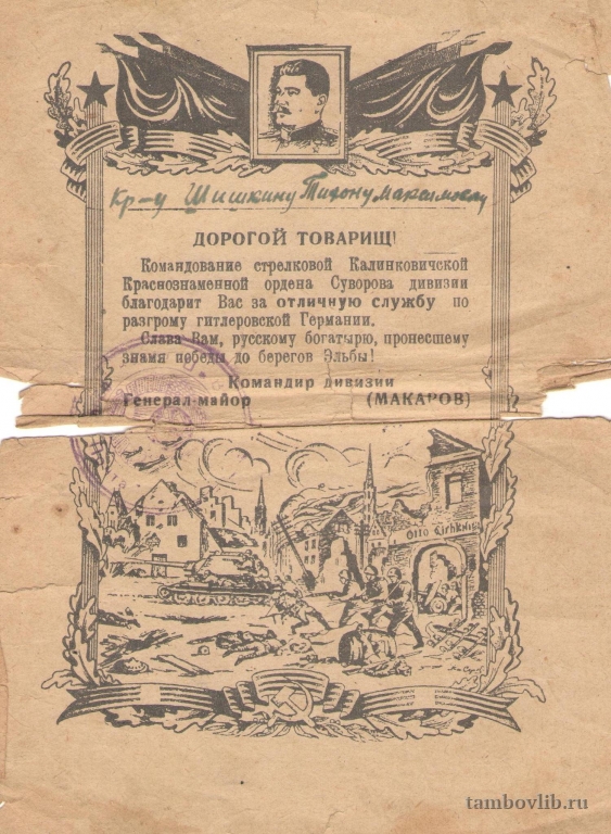 Шишкину Т.М. Благодарность за отличную службу по разгрому гитлеровской Германии