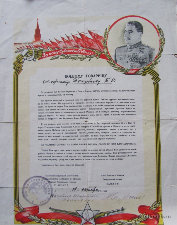 За честную службу на благо нашей Родины. 14.октября 1945 годаМежпоселенческая библиотека Рассказовского района Документ