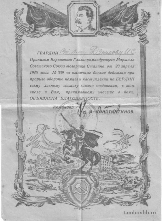 За боевые действия при прорыве обороны немцев и наступлении на Берлин.23 апреля 1945 Межпоселенческая центральная библиотека Пичаевского района Документ