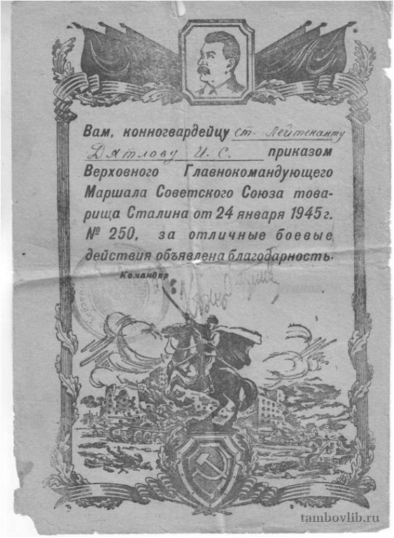Благодарность Дятлову Ивану Семеновичу, с. Пичаево